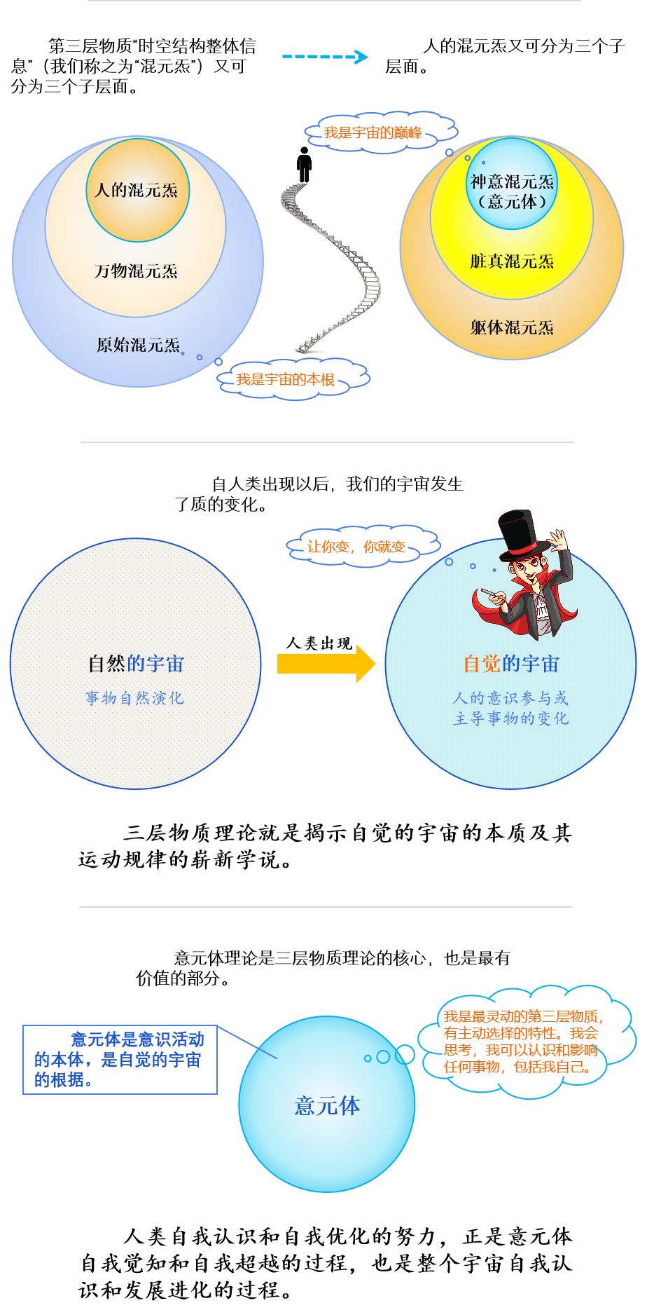“三层物质理论”的诞生虽然与气功修炼有着直接的重大关联,但它绝不是只为气功修炼者准备的练功指南,而是崭新的宇宙观(世界观)、认识论和方法论,是人的科学,是对自然界和人的生命运动规律的准确把握和深刻揭示,是人类科学文化事业发展进程中跃迁性的突破。所以,其理凡人皆适用,它是属于整个人类的。万万不可自以为,只有练习某气功功法才是在实践“三层物质理论”。